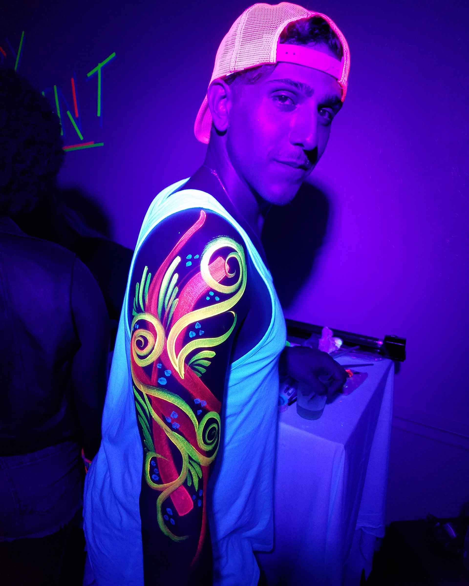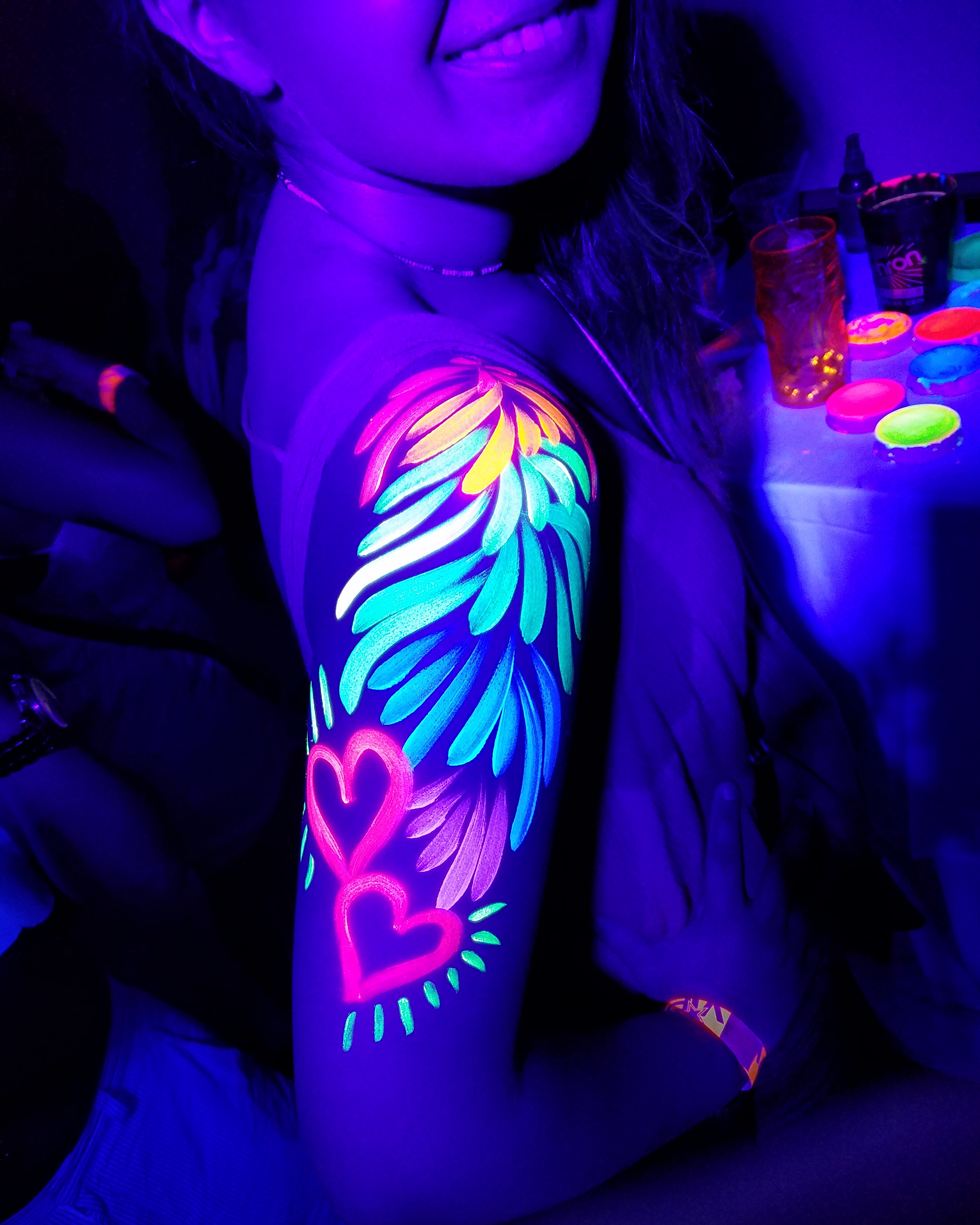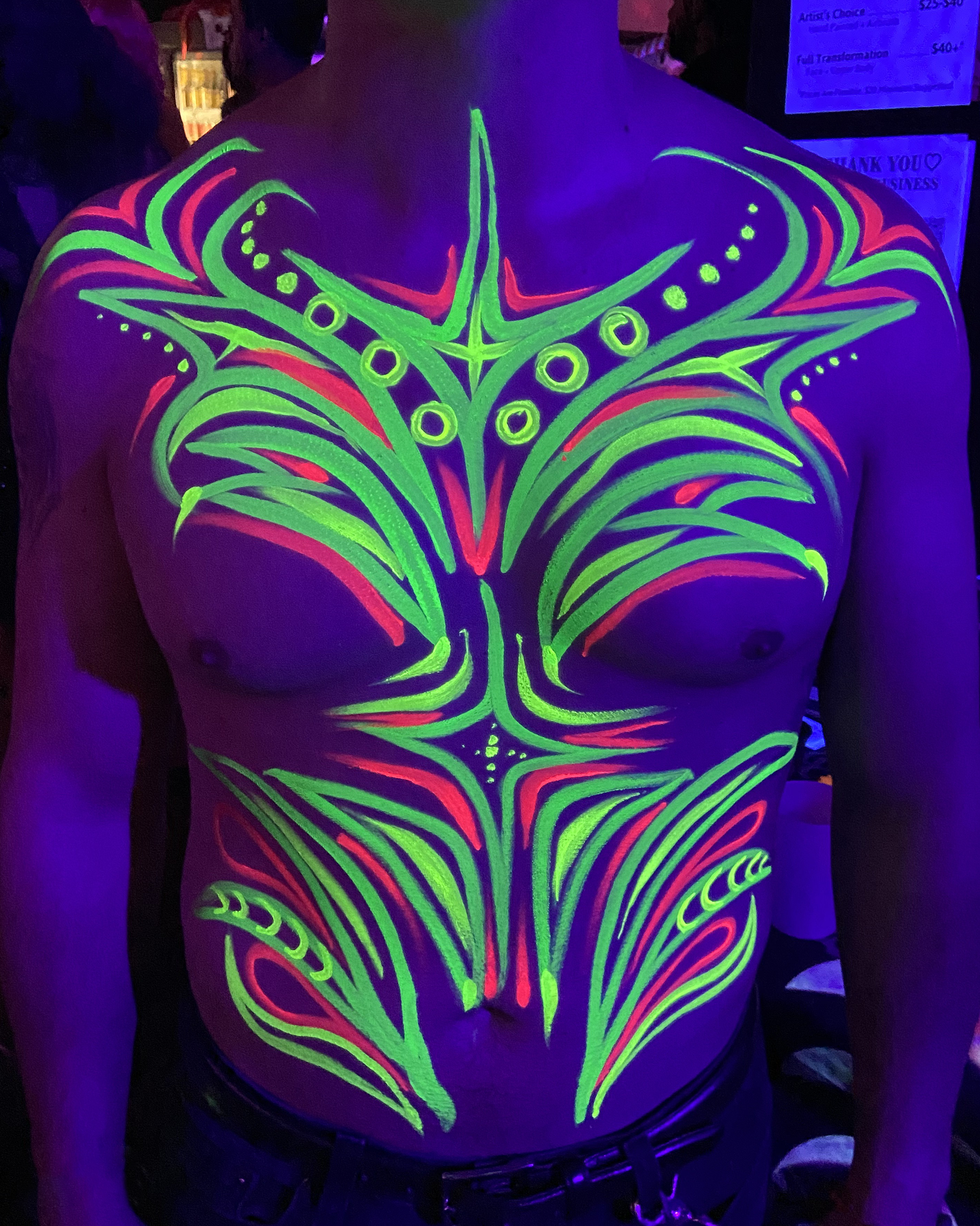 Jaskela Body Art is known for their event activations. Whether it be blacklight face and body painting, airbrushed stencil looks, or straight glitter and gems, we are prepared to elevate your guests' experiences!